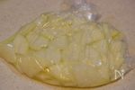 大根は皮をむき、3mm幅のイチョウ切りにする。ポリ袋に塩と共に入れ、水分が出るまでよく揉み込む。そのまま10分ほどおく。 | |