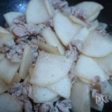 豚肉の色が変わったら、水気を絞った大根を加えて、サッと炒める。 | |