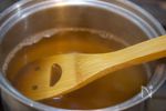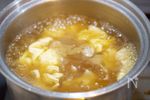 鍋にB 水 600cc、みりん、和風だしの素 各大さじ1、しょうゆ 小さじ1、塩 小さじ1/2強 を入れて強火にかけ、沸騰したら弱火にし、合わせたC片栗粉 大さじ1、水 大さじ2 を回し入れる。 |