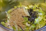 1の水気をしぼり、A 塩昆布 5〜8g、ごま油、いり白ごま 各大さじ1、鶏ガラスープの素 小さじ1、しょうゆ、レモン汁 各少々、にんにく チューブ2〜3cm と和える。 |
