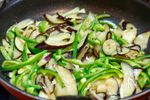 フライパンで鶏むね肉・なす・ピーマンを炒め