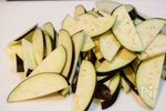 なすはヘタを取って縦半分に切り、さらに斜め薄切りにする。 | |
