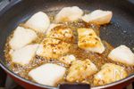 余分な油を拭き取り、合わせたB 粒マスタード、はちみつ 各大さじ1、しょうゆ、酒 各小さじ2、コンソメ顆粒 小さじ1、にんにく チューブ1〜2cm を回し入れ、全体に絡める。(煮詰まりやすいので、火を弱めてから加えると失敗がありません) |