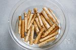 ごぼうは皮をこそげとって3〜4cm長さのぶつ切りにし、水にさらす。 | |