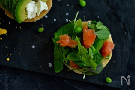 【作り方】 1. スナップエンドウは熱湯でゆでて冷水につけ水気を切る 2. プチパンケーキに洗ったベビーリーフ、1のスナップエンドウ、サーモンをのせて、オリーブオイルをたらし、塩こしょうをふったらできあがり