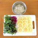 煮込んでいる間に次の具材を切る。レモン…薄く輪切り 水菜…3㎝くらいのざく切り 大根…おろす |