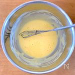 (じゃがいもを電子レンジにかけている間にバッター液を準備する。) A 小麦粉 大さじ4、たまご 1個、酢 小さじ1、酒 小さじ1 をダマにならないようによく混ぜる。※たまご、酢、酒をよくかき混ぜてから、ふるいにかけた小麦粉を混ぜるとダマにならずスムーズに作れます。 ※酢や酒のどちらかがない場合は半量を水、又は牛乳にしてください。 ※酢と酒の効果で衣がはがれづらく、揚げ物がさっくさくに揚がります。このバッター液はどのフライにも使えるので覚えておくと便利です! |