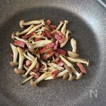 中火で熱したフライパンにサラダ油を馴染ませ、ベーコンとしめじにひとつまみの塩を振りかけて炒める。 | |