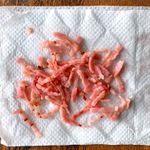 ベーコンを千切りにし、キッチンペーパーに包んで電子レンジに40秒程度かける。 | |