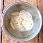 れんこんは皮をよく洗ってからお好みの厚さに切り、酢水(分量外)に浸しておく。 ※こちらでは3㎜程度の厚さにしています。 ※見栄えや味染みを良くするためには皮をむき、栄養を丸ごと摂りたい場合は剥かなくても◎お好みに合わせてください。 ※変色を防ぎ、シャキシャキ食感にするために酢水につけます。もし酢がなければ、水に浸けるだけでも変色は防げます。 |