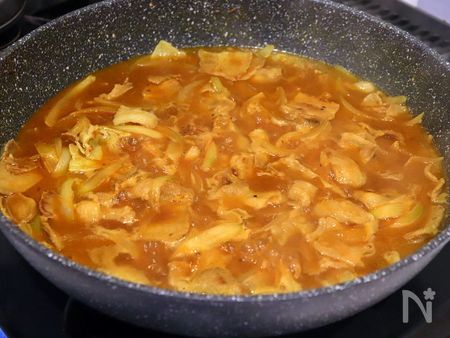 5.Bを加え、蓋をして弱火で2~3分煮ます。