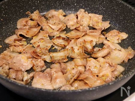2.フライパンにごま油を熱し、にんにくとしょうがを加え弱火で炒めます。中火にし、豚肉を加えます。豚肉を時々返しながら、全体にこんがり焼き色を付けます。にんにくと生姜はしっかり炒めて、香ばしさを引き出すのがポイントです。