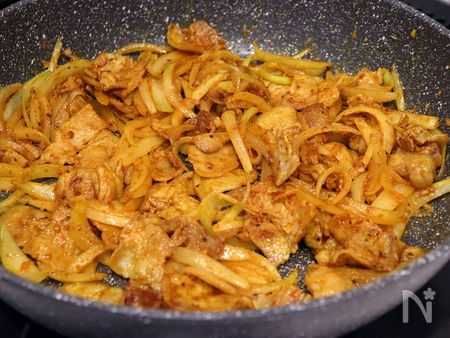 3.玉ねぎを加えてさっと炒めます。食感を残すため、短時間で炒めるのがポイントです。