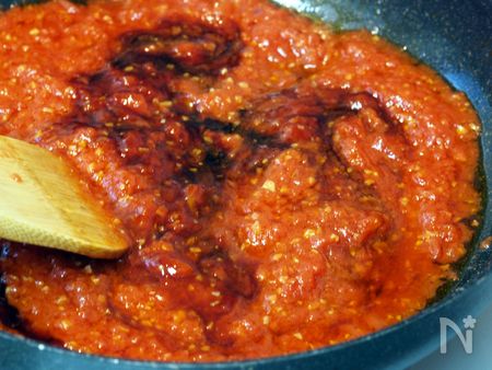 2、こんがり色づいたらカットトマトを加え、木べらなどでトマトを潰しながら弱火で加熱します。