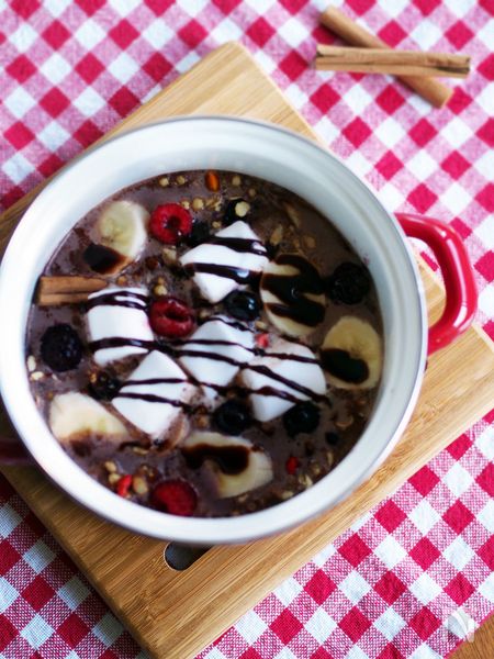 チョコバナナ、マシュマロ・・・子供の大好きを詰め込んだようなフルーツ鍋。牛乳とココア、シナモンスティックココアを入れて混ぜてスープのベースを作り、牛乳を少しずつ足してのばしていきます。ベリーの酸味が程よいアクセントに。最後に残ったスープをエスプレッソで割るとフルーティーなチョコラテを楽しめますよ♪