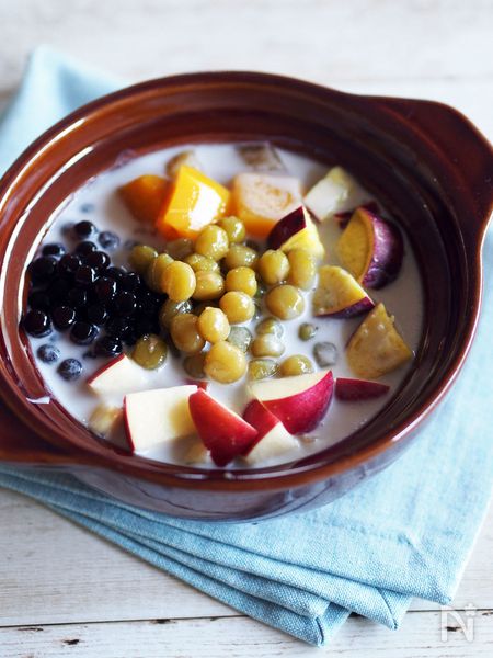 ベトナムの人気デザート「チェー」をイメージしたフルーツ鍋。ココナッツミルクベースの甘いスープにに茹でた黒タピオカとさつまいもやリンゴ、マンゴーなどのフルーツを入れて煮込みます。ほっこり甘い具材に、しゃきしゃきのりんごがアクセント!