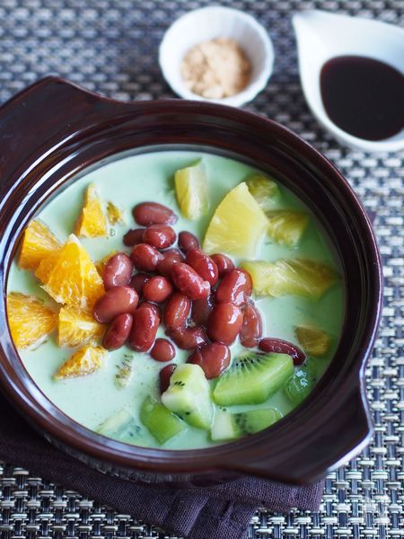 フルーツぜんざいをイメージした和風のフルーツ鍋。抹茶ミルクのスープに、パイナップルやキウイ、オレンジ、きんとき豆を入れて温めます。甘みと苦み、爽やかな酸味のバランスに手が止まりません。お好みで黒蜜やきな粉をかけてお召し上がりください。