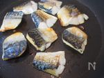 サバは骨を抜き、ひとくち大のそぎ切り。 全体に塩をふって下味をつけます(塩サバの場合は塩ふりは省略) フライパンに油少々を熱し、表面にこんがり焼き色をつけます。 |