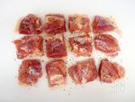 鶏肉を一口大にカットし、A 塩 小さじ1/2、黒コショウ 少々 をふります。厚みのあるお肉&甘いソースと合せるので、下味はいつもよりしっかりめにふっておくのが美味しさのポイント。 |
