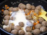 肉だんご(冷凍)は凍ったまま加えてOK。 白ワインを加え、蓋をして弱火で10分ほど蒸し煮します。 |