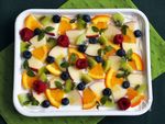 お好みのフルーツをたっぷりのせて出来上がり。 写真では、オレンジ・りんご・キウイ・ブルーベリー・ラズベリー・ミントの葉を飾ってます。 |