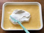 ボウルにB 生クリーム 200g、砂糖 大さじ2 を合わせ、七分にホイップします。冷やした2にふわりのせ、全体にのばします。 |