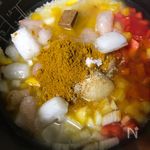 シーフードミックス、玉ねぎ、パプリカ、A コンソメ 2個、カレー粉 大さじ1 の調味料を加えたら全体をザッと混ぜて普通に炊飯のスイッチを入れる。 |