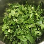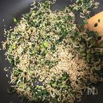 大根の葉がしんなりしてきたら、砂糖・しょう油・酒を加えて汁気がなくなるまで炒めたら、炒りごまを加えて出来上がり。 | |