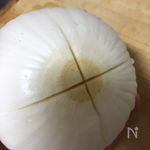 新玉ねぎは上下切り落として皮をむく。(大きめの時は根の方に十字に切り込みを入れる) | |