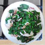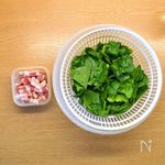オリーブオイルをしいたフライパンで、ベーコンを炒め、火が通ったらほうれん草も加え、塩胡椒をふる。 | |