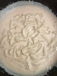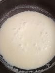 牛乳を100mlずつ加え、小麦粉のダマが残らないように、泡だて器を使って常にまぜる。 火加減:常に中火 |
