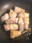 フライパンにカットした豚バラを並べ両面焼き色を付ける。 (サラダ油不要) |