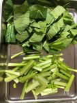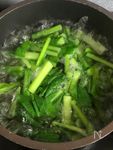 小松菜は3㎝幅にきり、葉と茎を分けておく。 | |