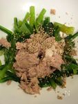 ボウルに小松菜、油を搾ったツナ、A 酒 小さじ2、ごま油 小さじ1、醤油 小さじ1/2、砂糖 小さじ1/2、鶏がらスープの素 小さじ1/3 を加える。 |