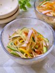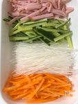 人参、きゅうり、ハムを細切りにする。 | |