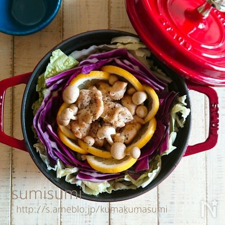 うまく鍋に詰めるコツは、最初に大量の白菜をしいて「底上げ」をすることです。重ねた白菜の上にメインの具材であるキャベツ、トマト、鶏肉、しめじをぎゅっと詰めます。