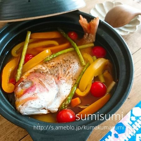 一見雑に聞こえますが、一尾の魚が丸ごと入った鍋は、いい意味でフォトジェニック! パプリカやアスパラを入れてカラフルにすると、女子会にもぴったりな鍋になりますよ。