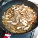肉をもどし、切ったしいたけと、しらたきを入れてひと煮立ちさせて完成! | |