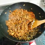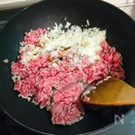 オリーブオイルで合いびき肉と玉ねぎを先に炒める。 | |