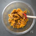 かぼちゃは種を取り皮付きのまま洗いふんわりラップに包む。レンジで5~6分柔らかくなるまで加熱する。皮を取り除き、ボウルに入れ潰す。 | |