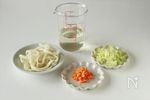 【後期食】 ゆでうどん:60g だし汁:120~150ml 豚肉:15g きゃべつ:20g にんじん:10g 水溶き片栗粉:適量 醤油:少量 |