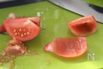 トマトは1/8個分を使います。 タネは取り除き、皮は包丁でそぎ取ります。 (皮などはよければパクッとしてください。) |