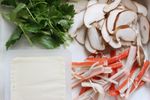 しいたけは、軸を切り、薄くスライスし、カニかまぼこは、裂く。三つ葉は、2cmの長さに切る。 | |