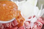 牛切り落とし肉に、塩、粗挽き黒こしょうをふる。 玉ネギは、薄くスライスする。 ボウルに、牛切り落とし肉、玉ネギ、A 味噌、はちみつ 各大さじ2、コチュジャンしょうゆ 各小さじ2、酒 大さじ2、しょうが、にんにくチューブ 各5cm を入れ、よく混ぜる。 |