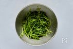 豆苗は根元を落とし、半分の長さに切り、耐熱の器に入れてラップをし、電子レンジ600W1分加熱し、ラップを取り、触れる熱さになったら絞って水気を切り、B すりごま(黒) 小さじ1、ごま油 小さじ1、にんにくすりおろし 小さじ1/4、塩 少々 と和える。 |