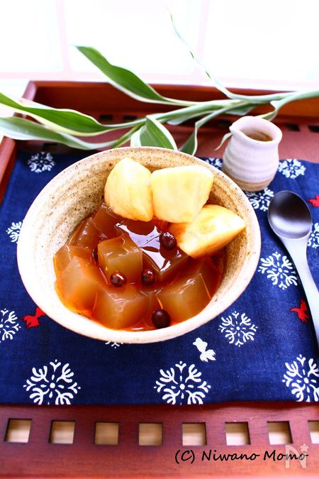 上品に香るルイボスティーは、実は和風のひんやりスイーツとも相性抜群。こちらはルイボスティーで作った寒天に、ルイボスティーを煮詰めたみつをかけていただく極上のみつ豆寒天。かけるみつの量でカロリーを加減できるので、ちょっとしたおやつにも最高ですね♪
