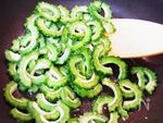 フライパンにごま油としょうがを熱して、香りが立ったら 水けをよく切ったゴーヤーを入れて鮮やかな緑色になるまで炒める。 |