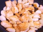 鶏むね肉(皮なし)はそぎ切りにしてA 酒 大さじ1/2、きび糖 小さじ1、塩 小さじ1/8、こしょう 少々 をもみ込み、薄く片栗粉をはたいて油で揚げ焼きする。両面焼けたら、いったん取り出す。 |