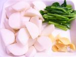 かぶは皮をむき、くし型に8等分くらいに切る。 かぶの葉はラップに包んで電子レンジで1分半~2分ほど加熱(※600W)し、 水けをしぼって食べやすく切る。しょうがは薄切りにする。 |