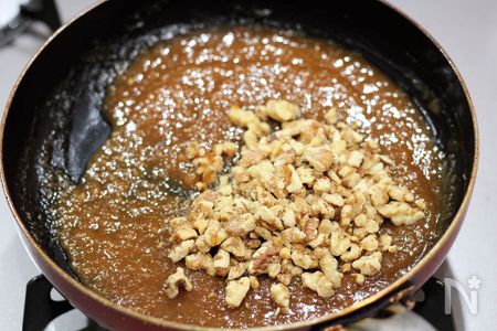 ③ 同じフライパンに、味噌、砂糖、みりんを入れてへらで混ぜながら火にかける。ふつふつしてきたら弱火にし、水っぽさがなくなりツヤが出てきたらくるみを加えて 混ぜて火を止める。